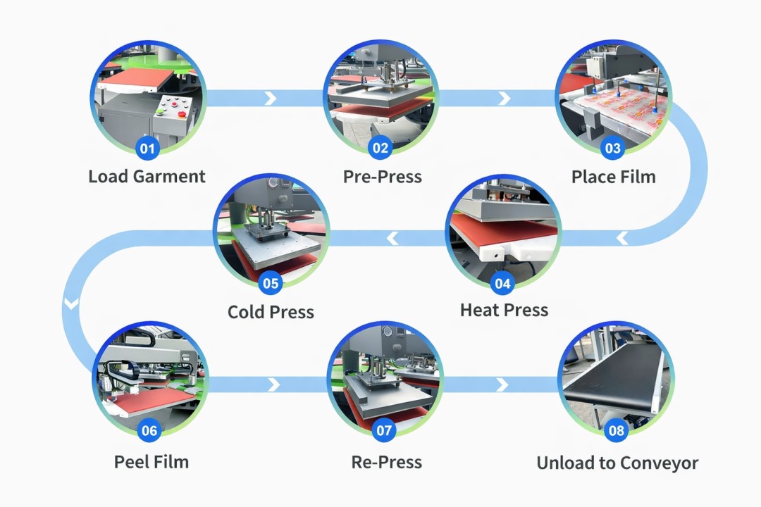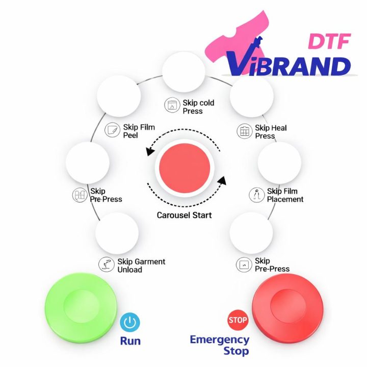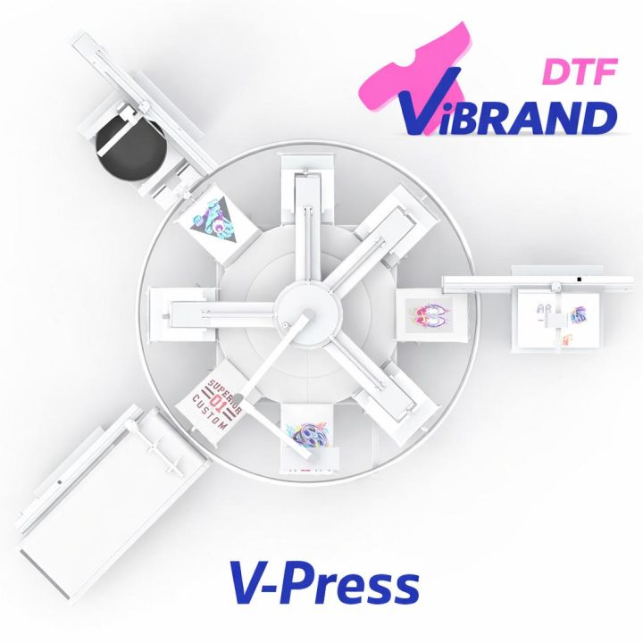 The V-Press Robot System is an intelligent, fully automatic 6-station rotary heat press engineered for high-volume DTF and heat transfer production.